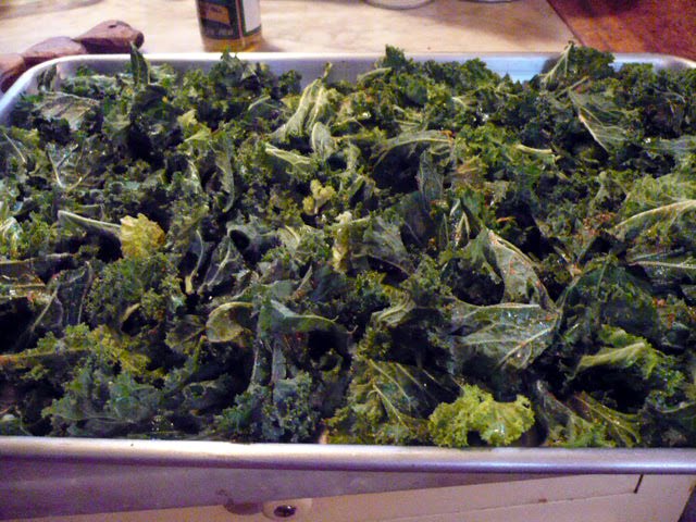 Thoroughly coat with Olive Oil............... but lightly, place on baking sheet and put in the oven at a preheated 450 degrees. Notice the leaves are mounded, no need for single layering.